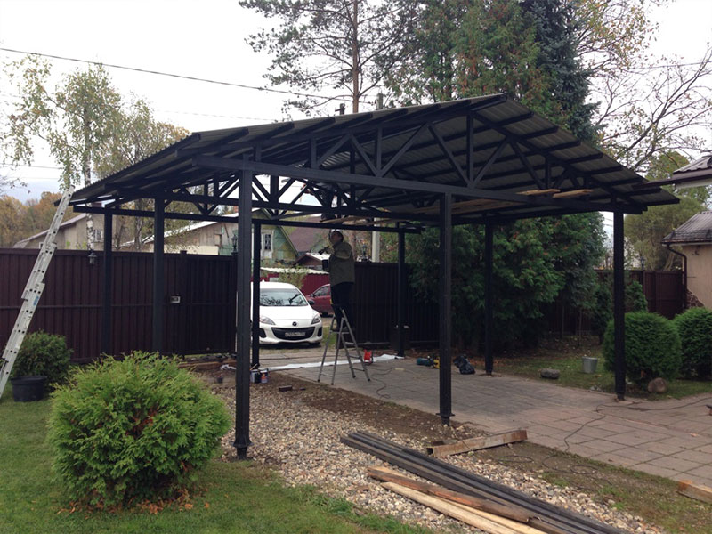 Одна из сторон навеса — выше противоположной. Угол наклона крыши – 30/35 °.